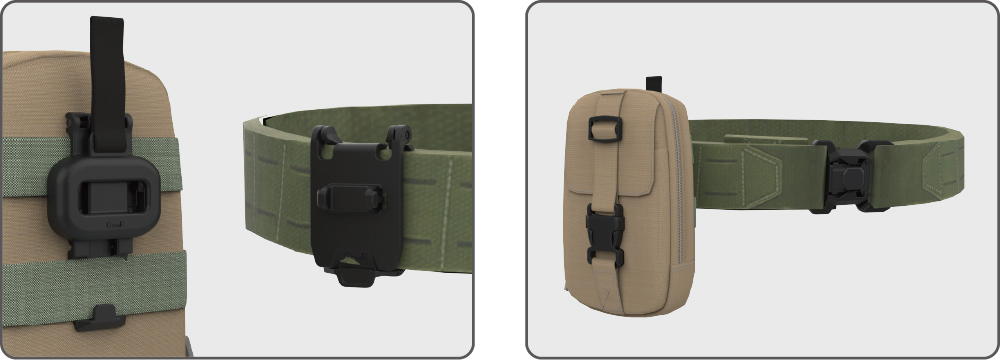 此公扣固定在50mm宽的腰带上,夹持厚度为2-6mm。此公扣在母扣扣入后,相对于腰带为水平方向。适用于把弹夹,腰包,工具袋等固定在腰上。
