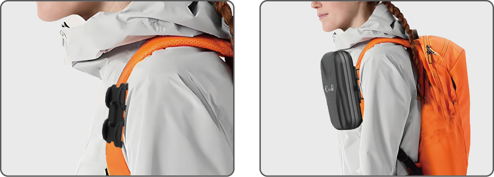 此公扣用两条硅胶圈固定在背包肩带上,搭配E08各种母扣使用,如固定证件包等。