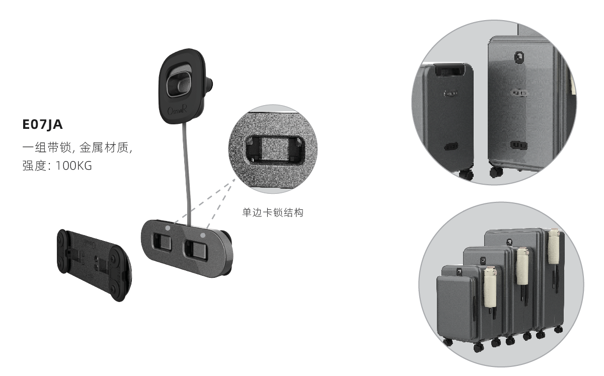 该系统专门设计用于附件与主体结构的高效快速连接与分离。其应用范围包括时尚包、背包、行李箱、手提箱或类似物品。